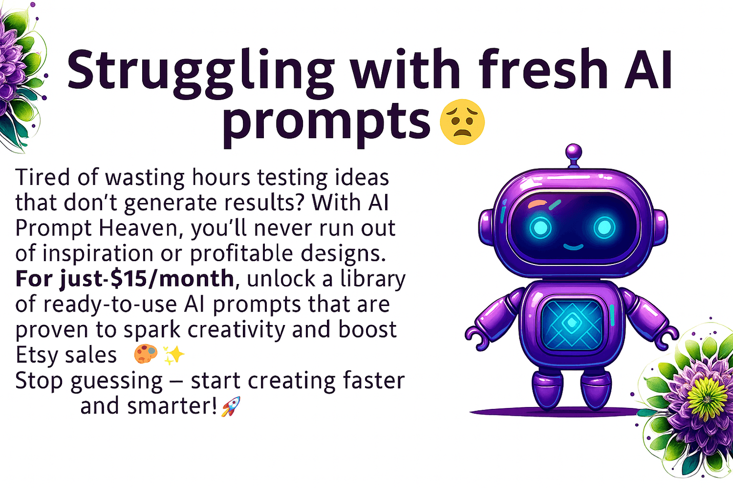 Stop struggling with design ideas! Gain access to a vault of high-quality AI prompts that will supercharge your creativity and drive your Etsy sales.